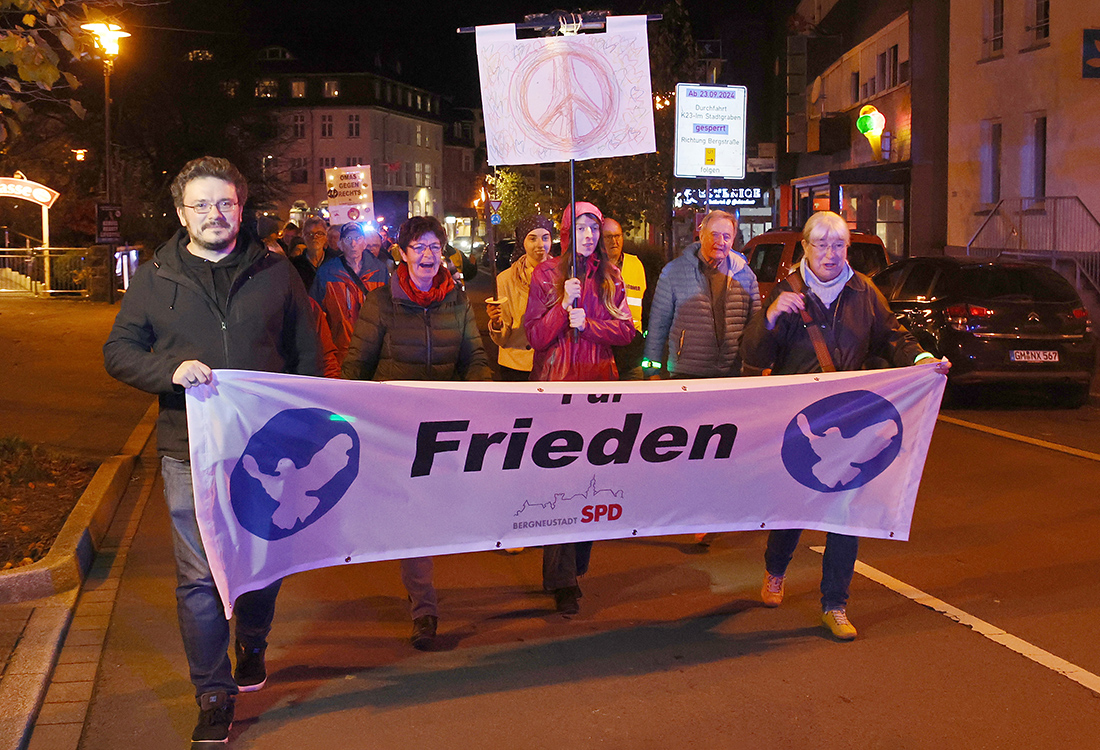 Seit 1991 organisiert die Bergneustädter SPD, später gemeinsam mit Bündnis 90/Die Grünen, Friedensdemonstrationen in der Feste. Rund 100 Teilnehmer zogen gestern mit Fackeln und schweigend durch die Innenstadt über die Kölner Straße, durch die Druchtemicke und die Altstadt. Zurück auf dem Rathausplatz, fand eine Abschlusskundgebung für Toleranz, gegen Gewalt, Rassismus und die aktuellen Kriege in der Ukraine und Nahost statt.