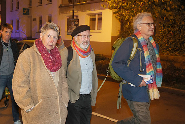[Gerd Wilden (Mitte) und Dr. Ralph Krolewski äußerten nach dem Schweigemarsch auf den Rathausplatz ihre Gedanken zum Frieden.]