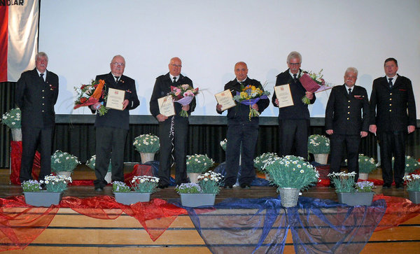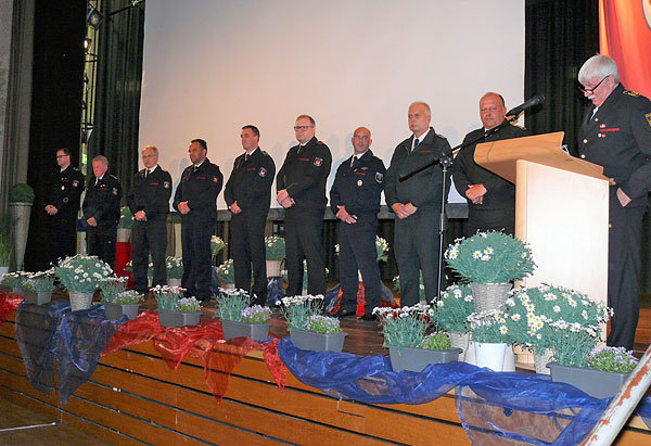 [Die Führungsriege Wilfried Fischer (links) sowie Frank Hartkopf und Mathias Schneider (5. und 6. v.li.) ernannten die neuen Mitglieder der Ehrenabteilung.]