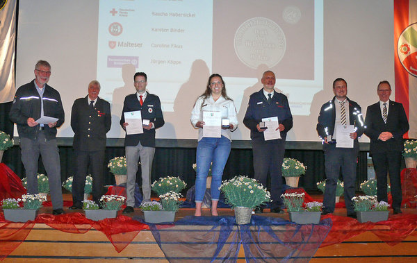 [Jürgen Köppe (Kreisbeauftragter THW, v.li.), Sascha Habernickel (DRK), Caroline Fikus (MHD), Karsten Binder (Feuerwehr Hückeswagen) und Tobias Starke (DLRG) wurden von Landrat Jochen Hagt mit der Fluthelfermedaille des Landes NRW ausgezeichnet.]
