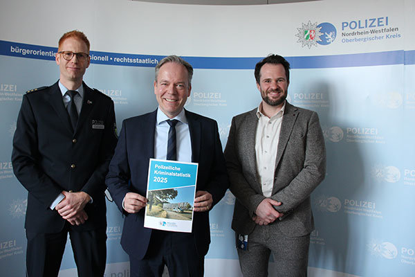 Der Oberbergische Kreis ist zum dritten Mal in Folge landesweit der sicherste Landkreis. Dies hat Landrat Klaus Grootens heute bei der Präsentation der Kriminalitätsstatistik für das Jahr 2025 bekanntgegeben und die Polizei und auch die kommunalen Ordnungsämter ausdrücklich gelobt. Das heißt: Die Gefahr, in der Region Opfer einer Straftat zu werden, ist am geringsten in NRW. Dass dies trotzdem vorkommt, zeigten die Zahlen, die von Polizeichef David Clemens und Daniel Gehrke, Leiter der Direktion Kriminalität, vorgestellt wurden. Mit insgesamt 10.925 Fällen waren es 1,97 Prozent weniger als im Vorjahr (2024: 11.145). Mit der Aufklärungsquote von 59,56 Prozent belegt die Oberbergische Polizei den fünften Platz landesweit, wenngleich die Zahl auch sank (2024: 61,4 Prozent).