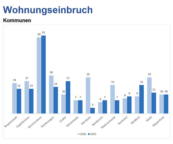 Hier steht mit 411 Fällen die niedrigste Zahl seit fünf Jahren, 86 weniger als im Vorjahr. Dies gelte auch für die Fallzahlen Raub sowie schwere und gefährliche Körperverletzung auf Straßen, Wegen und Plätzen, Kriminalität im öffentlichen Raum also (2025: 143, 2024: 162). An diesem Beispiel zeigt sich auch stellvertretend, dass die Kreisstadt Gummersbach als Tatort im Vergleich zu den anderen Kreiskommunen mit weniger Einwohnern eine „herausragende Rolle“ einnehme. Von den 143 Fällen passierten 60 in Gummersbach. In Bezug auf die Gesamtkriminalität kann man sagen: Rund 30 Prozent der Straftaten im Kreis wurden in der Kreisstadt verübt, was aufgrund des städtischen Charakters „nicht überraschend oder auffällig“ sei, so Grootens.