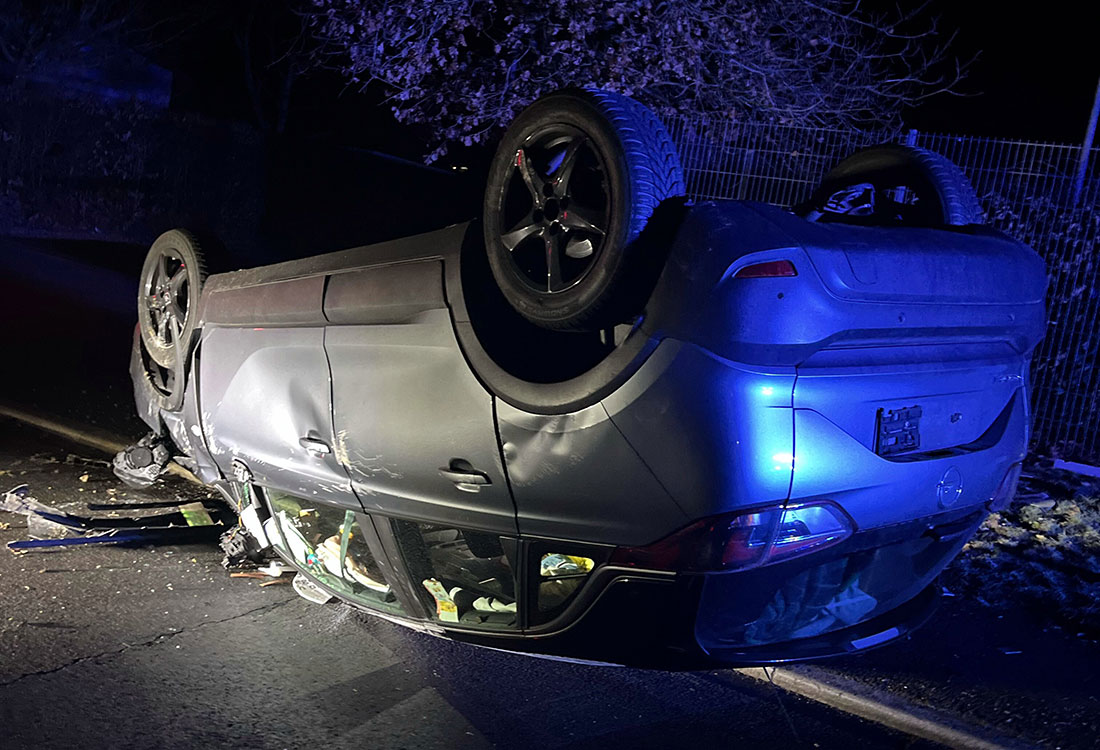 Am frühen Dienstagmorgen meldete ein Zeuge gegen 4 Uhr ein auf dem Dach liegendes Auto in der Straße "Auf den Pühlen" in Wiehl-Bomig. Als die Polizisten dort eintrafen, fanden sie einen auf dem Autodach liegenden Opel Crossland vor. Personen waren nicht in der Nähe und an dem Auto befanden sich keine Kennzeichen, schreibt die Polizei.