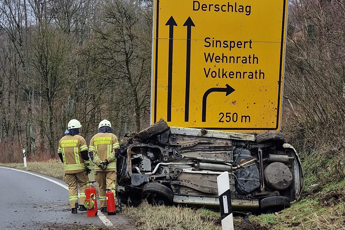 Zwei Leichtverletzte, ein abschleppreifes Auto und ein beschädigtes Verkehrsschild sind das Ergebnis eines Alleinunfalls am Samstag auf der B256 zwischen den Reichshofer Ortschaften Sotterbach und Volkenrath. Gegen 13:20 Uhr hatte eine Autofahrerin aus Waldbröl (30) aus bislang ungeklärter Ursache die Kontrolle über ihr Fahrzeug verloren und war auf den Grünstreifen des Autobahnzubringers geraten. Wie die Autobahnpolizei Köln auf OA-Nachfrage mitteilte, überschlug sich das Fahrzeug anschließend und wurde erst durch ein Verkehrsschild gestoppt.