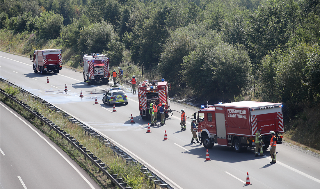 Auf etwa 100 Metern Länge stand dort eine Wiese in Flammen. Die 32 Kräfte unter Leitung von Daniel Noss teilten sich auf und bekämpften die Brandherde parallel. „Es gibt entlang der Autobahn keine Hydranten, deswegen sind drei Einheiten mit Tanklöschfahrzeugen ausgerückt“, berichtete der stellvertretende Wiehler Wehrführer Pascal Petermann nach dem anderthalbstündigen Einsatz.