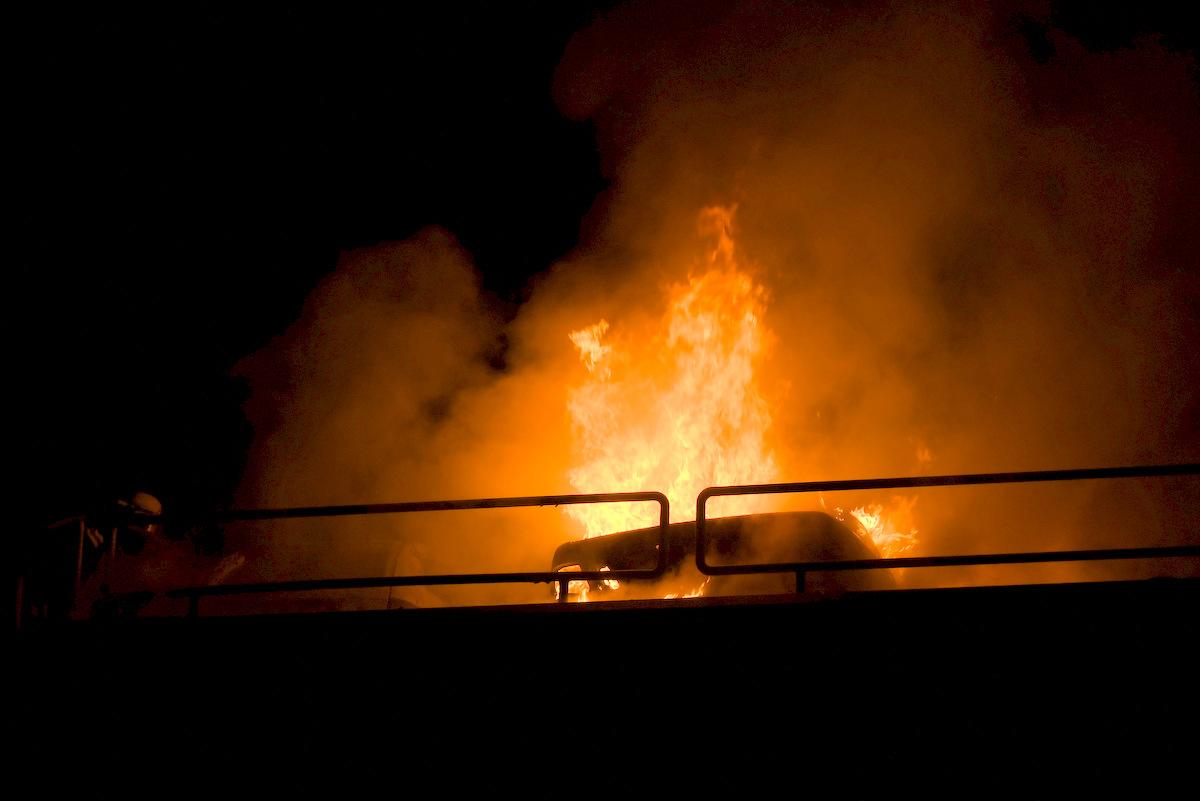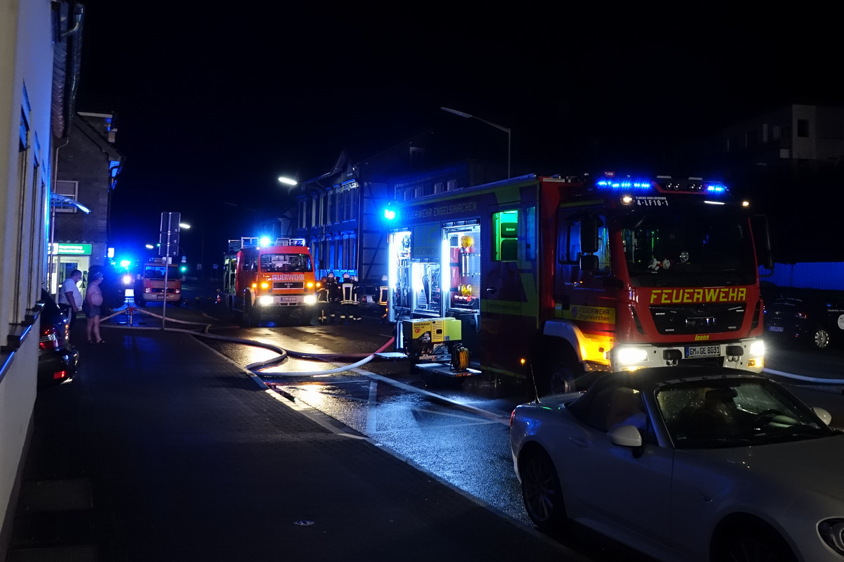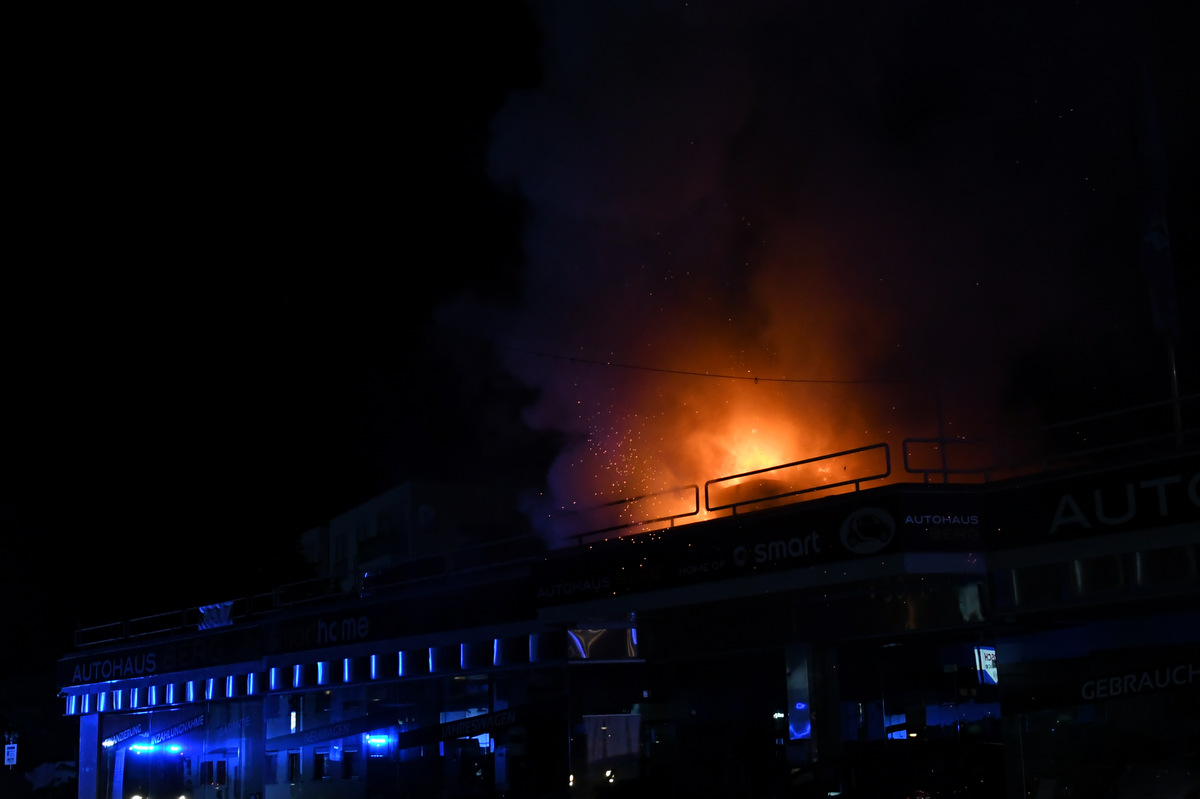 Nächtlicher Einsatz für die Feuerwehr Engelskirchen: Gegen 1:20 Uhr wurden die Einheiten Engelskirchen, Ründeroth und Loope zu einem Brand in die Bergische Straße gerufen. Bei Eintreffen der Wehrleute brannten auf der Parkfläche auf dem Dach eines Autohauses zwei Fahrzeuge in voller Ausdehnung. Wie Einsatzleiter Stefan Neier berichtet, handelt es sich um einen Mercedes und vermutlich einen Skoda Fabia.