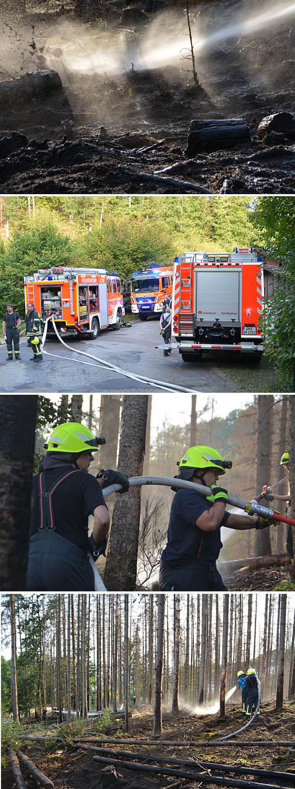 Rund 60 Feuerwehrleute der Löschzüge Bergneustadt, Dörspetal und Klein Wiedenest hatten am frühen Abend einen Waldbrand in der Bergneustädter Klevestraße rasch unter Kontrolle. Nach Aussage des stellvertretenden Leiters der Feuerwehr, Dirk Klaes, standen rund 400 Quadratmeter Fläche in Brand. Mit einem intensiven Löschangriff wurde den Flammen rasch der Garaus gemacht. Zunächst war befürchtet worden, dass sich das Feuer ausbreiten würde, sodass Dörspetal und Klein Wiedenest nachalarmiert wurden. "Wir haben nochmal Glück gehabt, das hätte auch anders ausgehen können", wies Dirk Klaes auf die Waldschäden und die Trockenheit hin, die schnell zu einem wesentlich größeren Schadensgebiet hätten führen können.