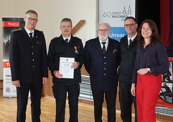 [Kreisbrandmeister Julian Seeger (v.li.), Karl Ernst Höffgen, Sonderauszeichnung in Gold für 50 Jahre Mitgliedschaft in der Feuerwehr, sein ehemaliger Mentor Harald Heidenpeter, früherer Löschgruppenführer Geilenkausen, der Höffgen vor 50 Jahren als 17-jährigen in die Waldbröler Feuerwehr geholt hat, Daniel Wendeler und Bürgermeisterin Larissa Weber.]