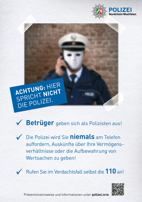 Sollten man einen derartigen Anruf erhalten, bittet die Polizei darum, sofort aufzulegen und unter der Notrufnummer 110 die örtliche Polizei zu informieren. Die echte Polizei wird sich nie am Telefon über Wertsachen in Häusern erkundigen oder Geld, Wertsache oder Schmuck in Verwahrung nehmen.