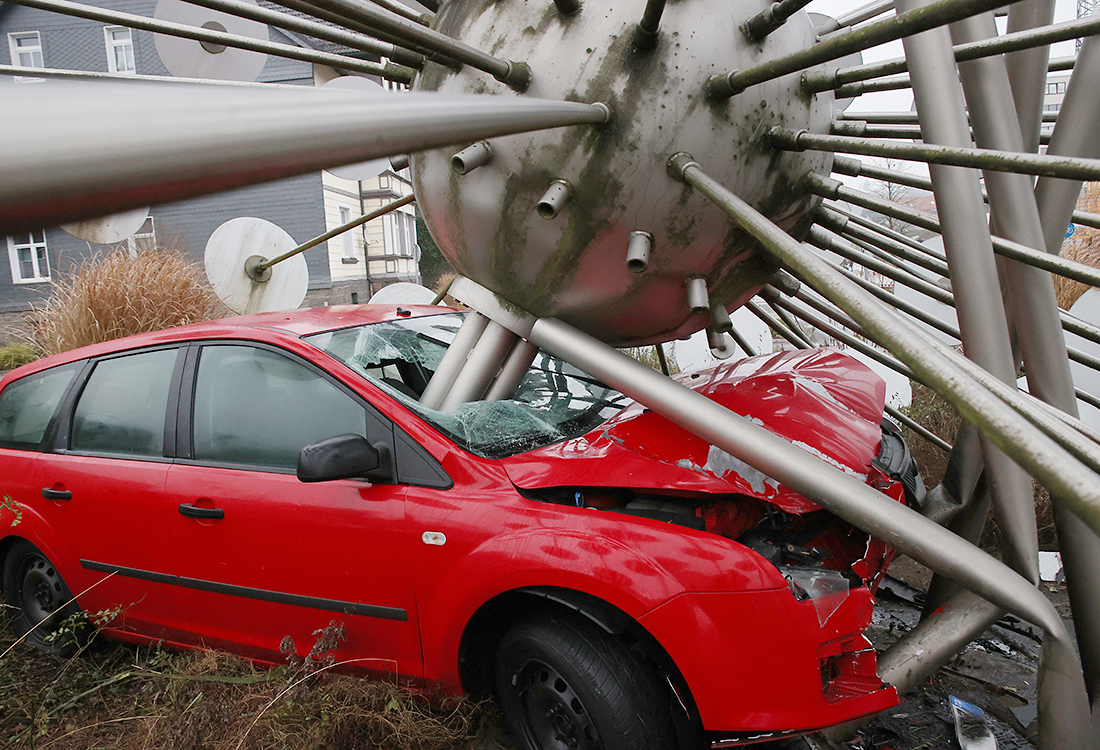 Aus ungeklärter Ursache verlor der Fahrer laut Polizeimeldung die Kontrolle über sein Fahrzeug und fuhr über eine Verkehrsinsel vor dem Kreisel. Von dort an hob das Auto ab und landete mittig in der Skulptur in Form einer großen Pusteblume. Das Fahrzeug landete zwischen den einzelnen Metallstangen. Bei der Unfallaufnahme versuchte der Fahrer die Beamten anzugreifen und wurde deswegen festgenommen. Außerdem hatte der Tscheche Alkohol getrunken, eine Blutprobe war fällig. Das Fahrzeug musste wegen der komplizierten Bergung vorerst an Ort und Stelle bleiben. Es wurde von der Feuerwehr bei Tageslicht geborgen.