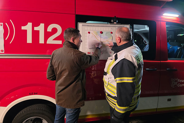 [Foto: Peter Notbohm ---- Gummersbachs Bürgermeister Raoul Halding-Hoppenheit (li.) lässt sich in Niederseßmar von Feuerwehreinsatzleiter Karl-Heinz Richter das Sperrgebiet für die Entschärfung der Bombe zeigen.]