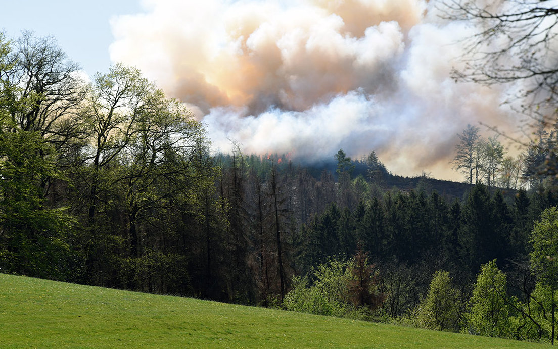In Hömerich bei Gummersbach-Strombach und Steinenbrück ist ein größerer Waldbrand ausgebrochen, eine kilometerhohe Rauchsäule ist weithin sichtbar. Mehrere Löschzüge der Feuerwehr Gummersbach bekämpfen die Flammen, die nach ersten Angaben der Einsatzkräfte vor Ort auf die Baumwipfel übergeschlagen sind und sich rasant ausbreiten.