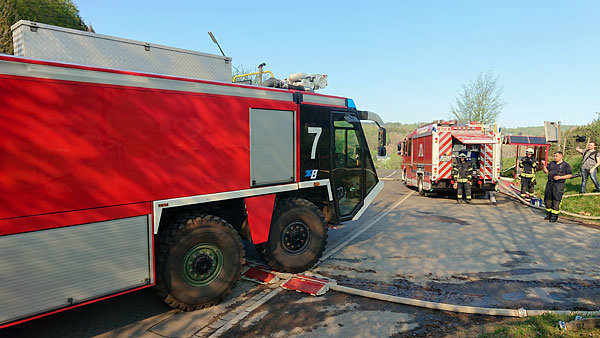 [Löschfahrzeuge vom Flughafen Köln/Bonn rückten an, um den Hof Hochhardt zu schützen.]
