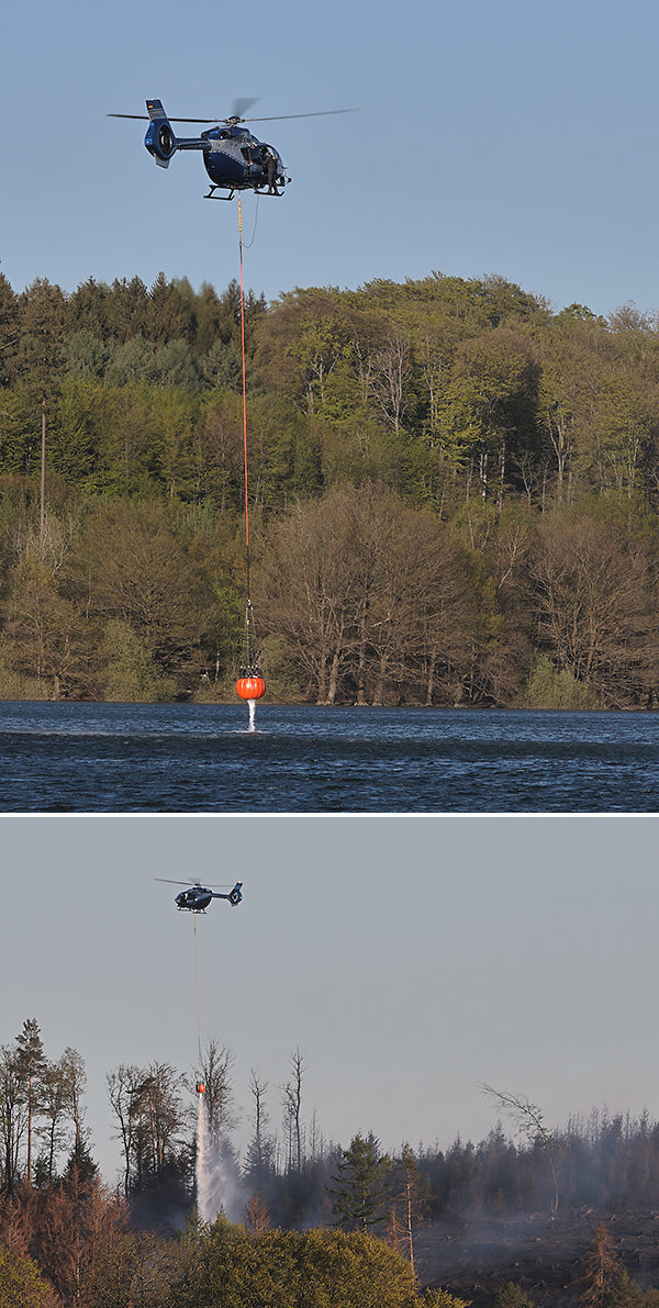 Der Löschhubschrauber nimmt an der Bruchertalsperre Wasser auf und fliegt anschließend zum Einsatzort, damit die letzten größeren Brandherde gelöscht werden können.