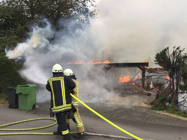 Wiehl - 38 Feuerwehrleute löschten heute Morgen das Feuer in einem Carport – Eine Person wurde verletzt.