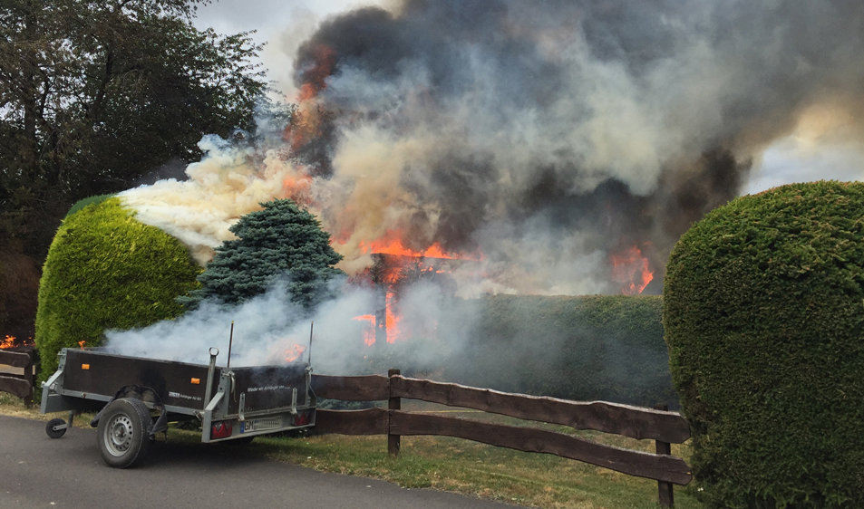 Die Feuerwehreinheiten aus Drabenderhöhe, Bielstein, Bomig und Wiehl rückten heute Morgen gegen kurz vor 11 Uhr zu einem Brand nach Wiehl-Immen gerufen. Bei Eintreffen der Einsatzkräfte standen dort ein kleiner Trecker in einem Carport und eine angrenzende Hecke, Bäume sowie ein Anhänger in Flammen. Mit drei C-Rohren hatten die Feuerwehrleute unter Leitung von Daniel Noss den Brand schnell unter Kontrolle.