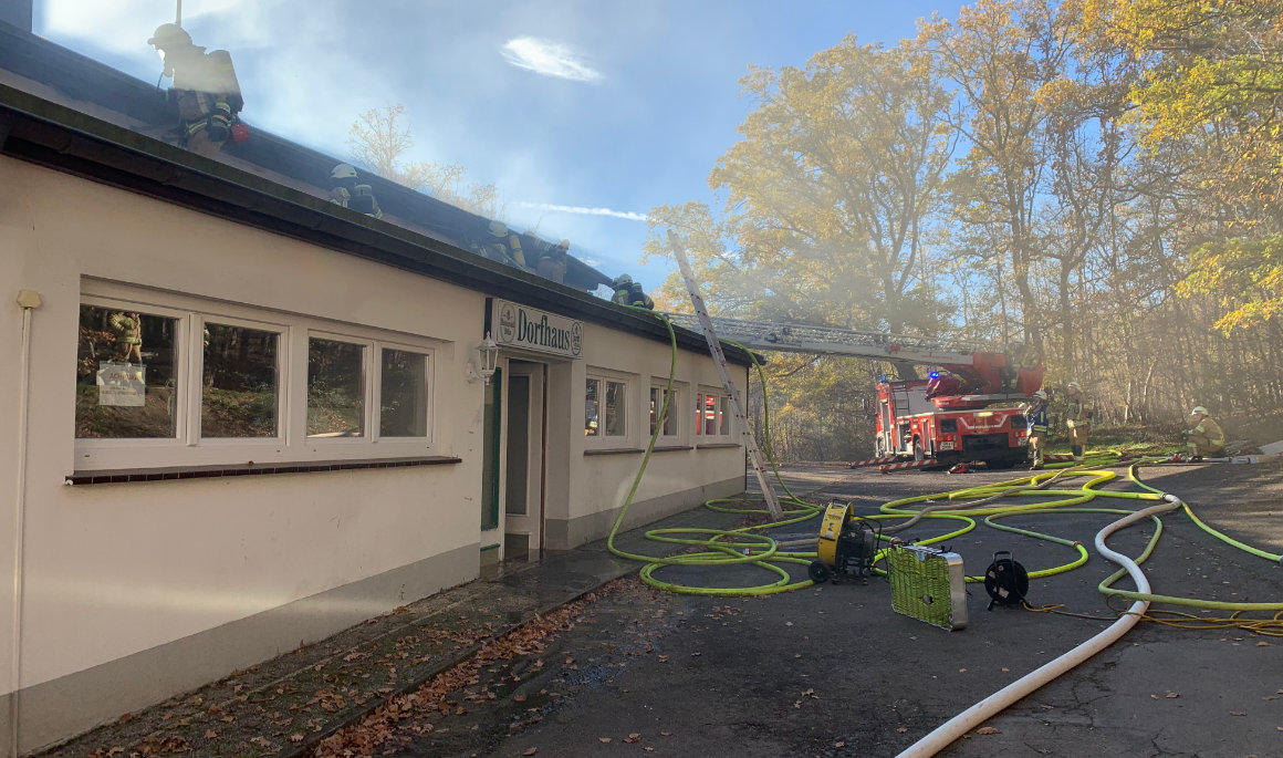Gegen 13:20 Uhr wurden die Feuerwehreinheiten Wiehl, BPW, Oberwiehl und Bomig zu einem Dachstuhlbrand in den Ortsteil Dreisbach gerufen. Wie Wiehls Wehrchef und Einsatzleiter Jens Schmidt vor Ort berichtete, stand dort das Dach des Dorfhauses in der Straße „Gutsberg“ in Flammen. Das brennende Gebälk in der Zwischendecke stellte die Einsatzkräfte vor eine Herausforderung, weil man das Blechdach nicht öffnen konnte.
