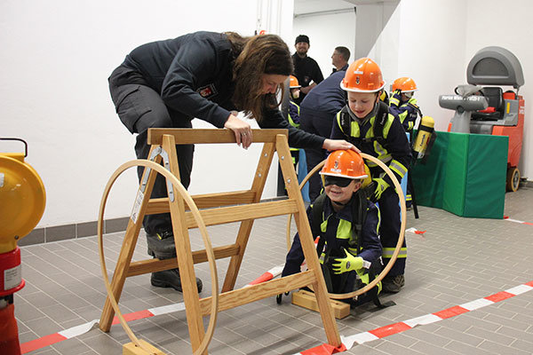 An dem Parcours war die Ausrichtung der Kinderfeuerwehr dann auch gut zu erkennen. Die Kinder gingen zu zweit auf die Strecke mit verschiedenen Herausforderungen, von dunklen Tunneln bis zum Schieben auf einem Wagen. Der Clou: Ein Kind hatte jeweils die Augen verbunden und konnte nichts sehen. Teamwork, Vertrauen, Verantwortung für andere zu übernehmen, das alles sind wichtige Themen bei den Feuerdrachen, die spielend Selbstbewusstsein stärken. Und wer gerade nicht den Parcours absolvierte, feuerte seine Kameradinnen und Kameraden (neben 14 Jungs sind sechs Mädchen mit am Start) mit lauten „Feuerdrachen vor!“-Rufen an. Hilfestellung gaben außerdem die Betreuer, von denen zwei extra in die Feuerwehr eingetreten sind und nun der Unterstützungsabteilung angehören.