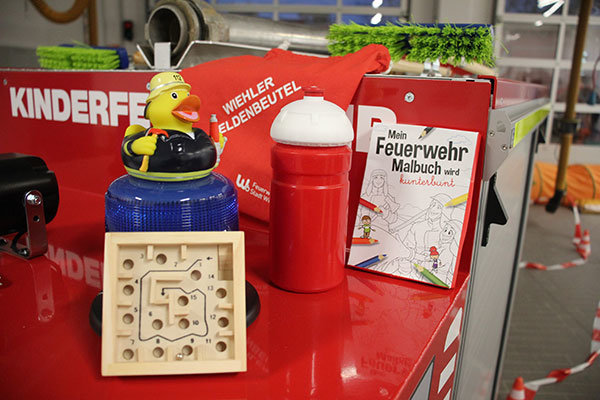 Wenn die „großen“ Feuerwehrleute gerufen werden, sind bei den Einsätzen immer wieder auch Kinder direkt oder indirekt betroffen. „Die Kinder sind in solchen Situationen emotional tief drin, es ist für sie eine besonders belastende Situation“, erklären Ronnie Müller und Pascal Petermann. Um die Kinder in diesen Ausnahmesituationen etwas abzulenken, haben die Wiehler um Brandschutzerzieher Müller den „Wiehler Heldenbeutel“ entwickelt. In dem roten Beutel befinden sich eine Trinkflasche, ein Malbuch mit Stiften, ein Geschicklichkeitsspiel und auch eine Badeente. „Wir werden nun unsere Fahrzeuge damit ausstatten, sodass bei jedem Einsatz die Heldenbeutel mit dabei sind. Das ist ein unbezahlbares Hilfsmittel!“