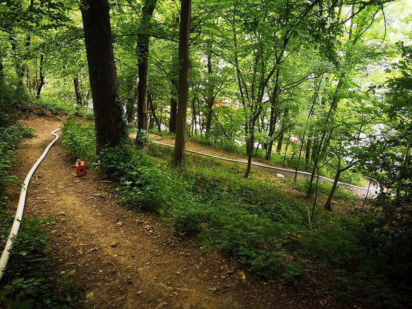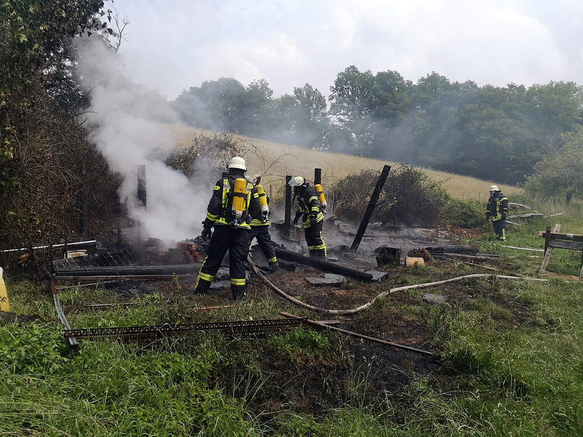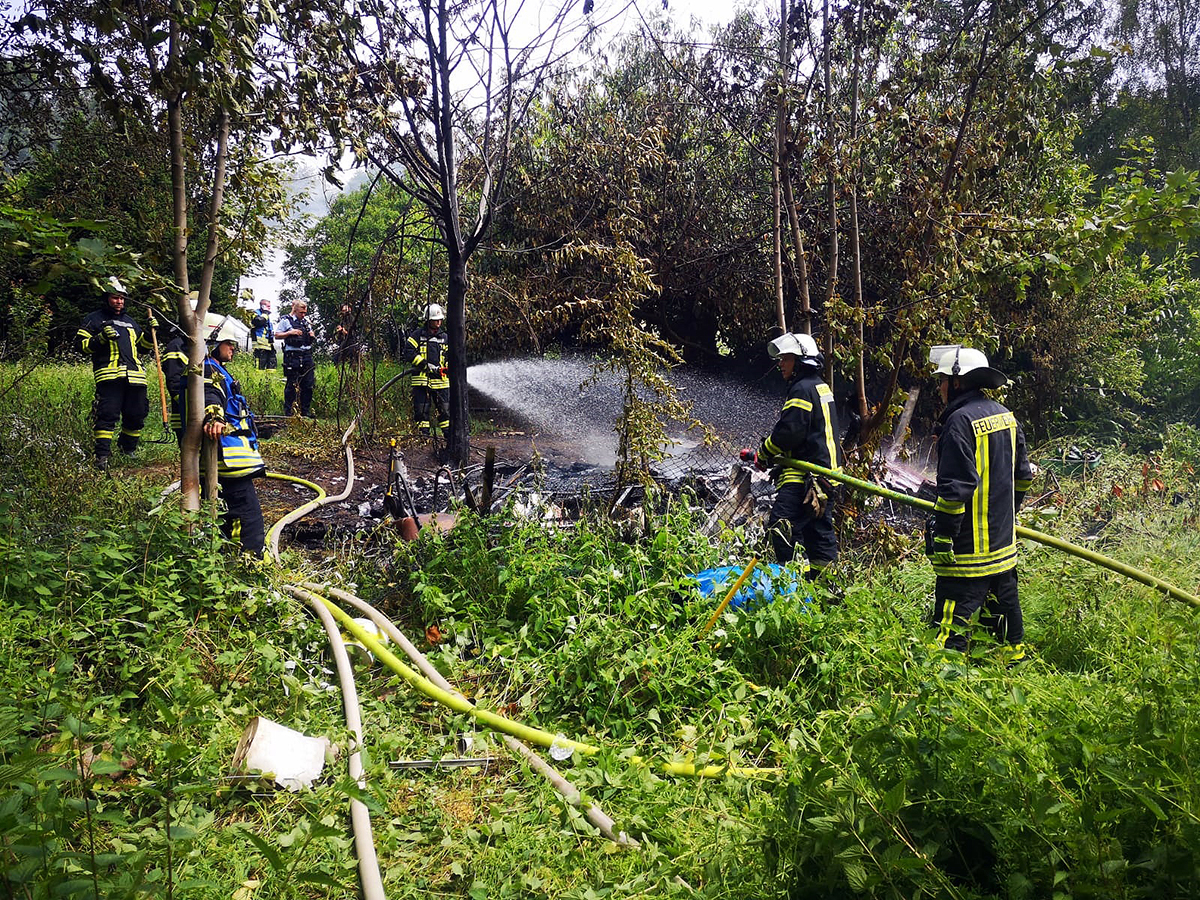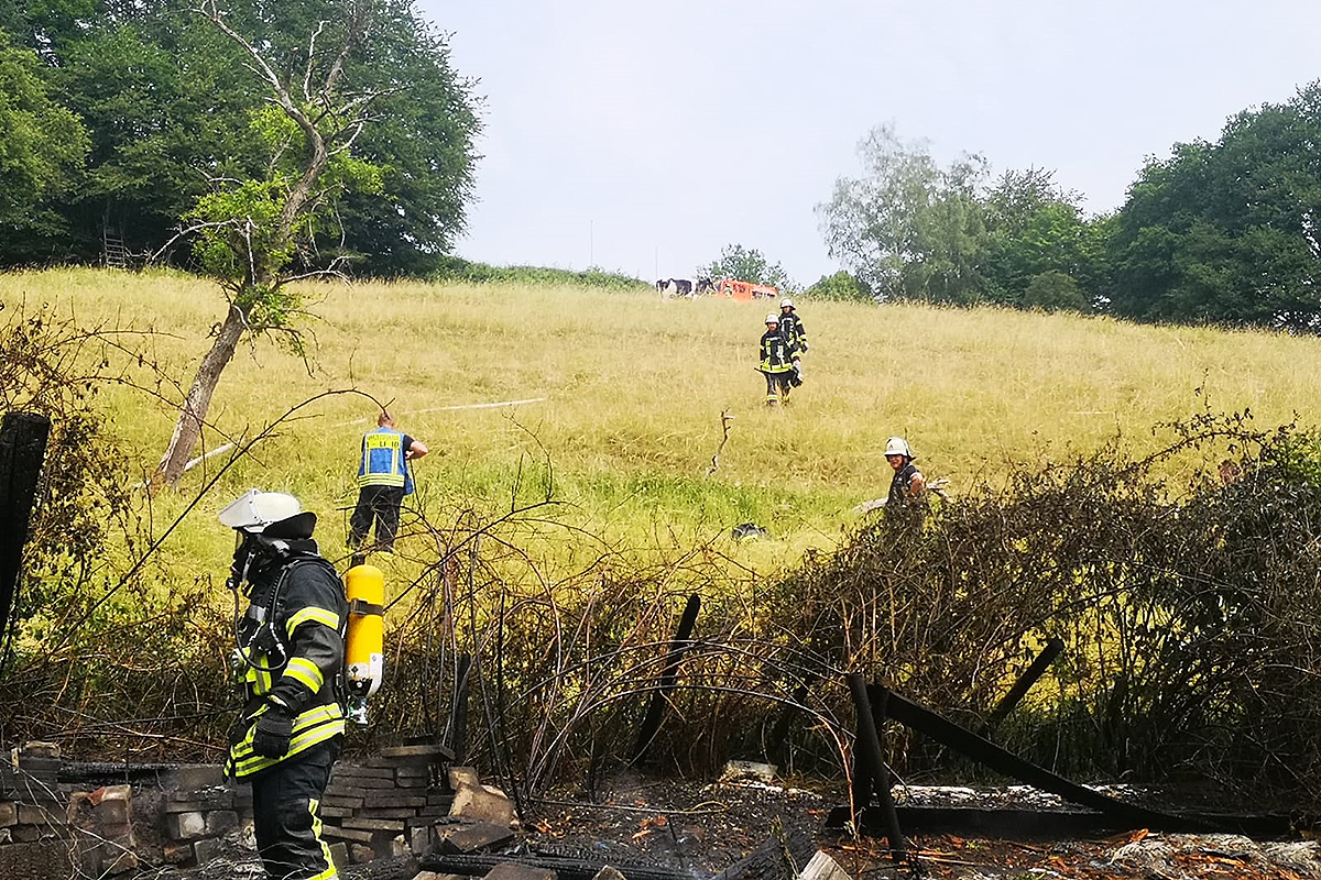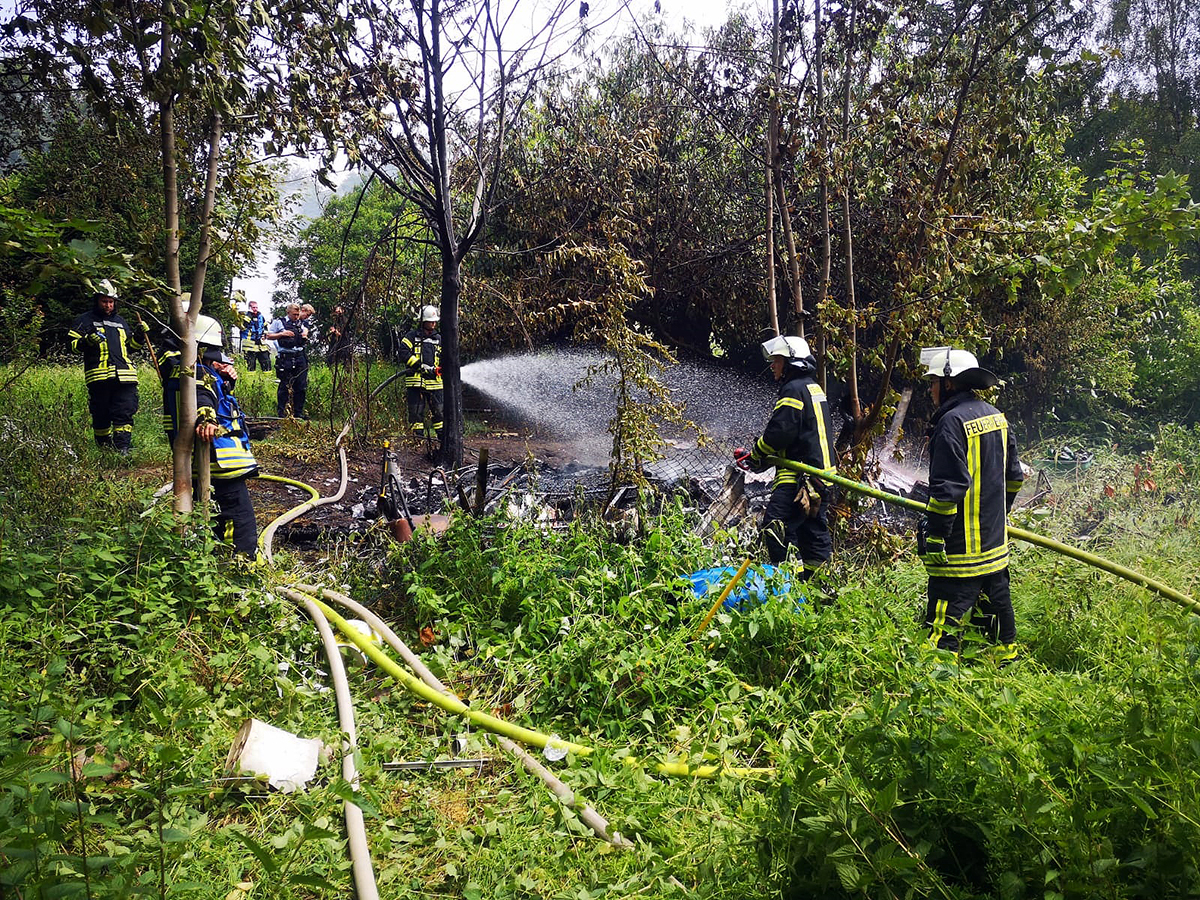 Bereits beim Ausrücken konnten die Einsatzkräfte der Feuerwehr die Rauchschwaden sehen, die am Hang unterhalb des Freibades Engelskirchen über den Bäumen standen. Gegen 12:40 Uhr hatte ein Zeuge den Notruf alarmiert, nachdem in der Umgebung der Straße „Kauertsrad“ eine Gartenhütte Feuer gefangen hatte. Vor Ort stellten Einsatzleiter Marc Schwamborn fest, dass sogar zwei 50 Meter voneinander entfernt stehende Gartenhütten in voller Ausdehnung in Flammen standen. Die Löscharbeiten gestalteten sich in dem unwegsamen Gelände anfangs schwierig. „Das Problem bestand darin, die Einsatzkräfte zu koordinieren und das Wasser zur Löschstelle zu bringen, weil das hier im Niemandsland liegt“, sagte Schwamborn.