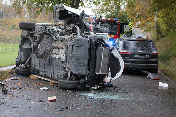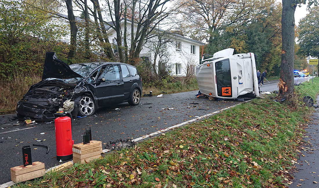 Zwei Verletzte und ein hoher Sachschaden sind die Bilanz eines Verkehrsunfalls, der sich heute Morgen auf der L 339 in Nümbrecht-Niederbröl ereignet hat. Die Polizei hat weitere Details zum Unfallhergang veröffentlicht. Demnach befuhr gegen 8:25 Uhr ein 71-Jähriger aus Waldbröl mit einem ansonsten unbesetzten Kleinbus die L 339 von Grötzenberg kommend in Richtung Niederbröl. Auf der nahezu geraden Strecke kam der Kleinbus aus ungeklärter Ursache nach rechts von der Fahrbahn ab und prallte kurz darauf mit der rechten Fahrzeugfront gegen einen Baum. Durch die große Wucht des Aufpralls schleuderte der Bus zurück auf die Fahrbahn, wo er mit dem linken Heck in die Front eines entgegenkommenden Ford eines 41-jährigen Nümbrechters prallte.