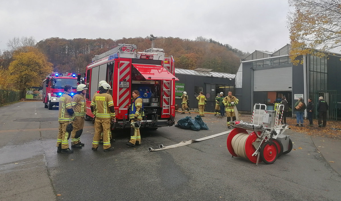 Heute Mittag gab es in der Wiehler Ortschaft Alperbrück einen größeren Einsatz der Feuerwehr. Wie Einsatzleiter Sebastian Fritz vor Ort berichtete, wurden die Einsatzkräfte um 11:59 Uhr zu einem Brand in einem Gartencenter alarmiert. Ausgebrochen war das Feuer in einem Büro. Mitarbeiter sollen den Rauch entdeckt, die Türe zu dem verrauchten Raum geschlossen und das Gartencenter geräumt haben. Bekämpft wurde das Feuer dem Einsatzleiter zufolge von einem Trupp im Innenangriff unter Atemschutz. Das Feuer konnte schnell gelöscht, sagte Sebastian Fritz. Die genaue Brandursache habe zwar nicht festgestellt werden können, soll aber mit einem „Elektroartikel auf einem Schreibtisch“ zusammenhängen. Vor Ort waren etwa 40 Einsatzkräfte der Einheiten Bomig, Wiehl und Oberwiehl. Verletzt wurde niemand.