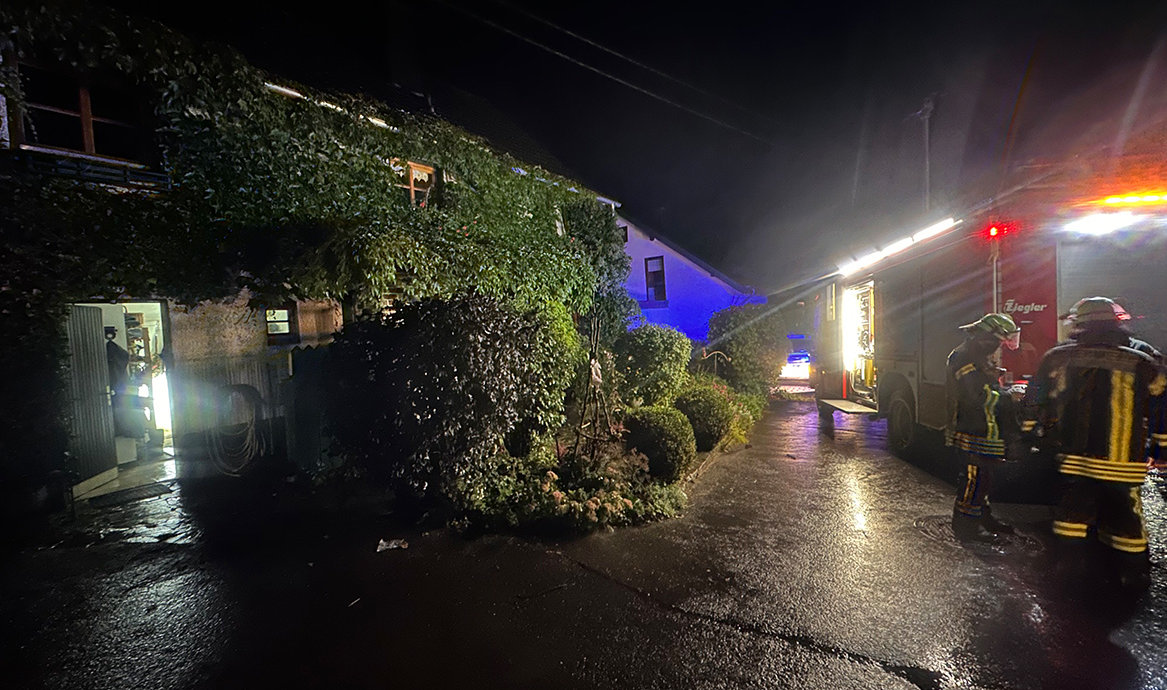 Schrecksekunde für zwei Bewohner in Waldbröl-Geiningen. In ihrem Einfamilienhaus waren gegen 21:50 Uhr Flammen ausgetreten, woraufhin das Ehepaar die Feuerwehr alarmierte. 45 Kräfte der Einheiten Thierseifen und Lichtenberg (Morsbach) sowie die Drehleiter aus Waldbröl waren binnen Minuten vor Ort. Wie Einsatzleiter und stellvertretende Wehrführer Sebastian Pack berichtete, erkundeten die Einsatzkräfte unter Atemschutz die Kellerräume, stellten dort eine Rauchentwicklung fest, entdeckten ein Leck in der Leitung und drehten daraufhin den Gashahn zu.