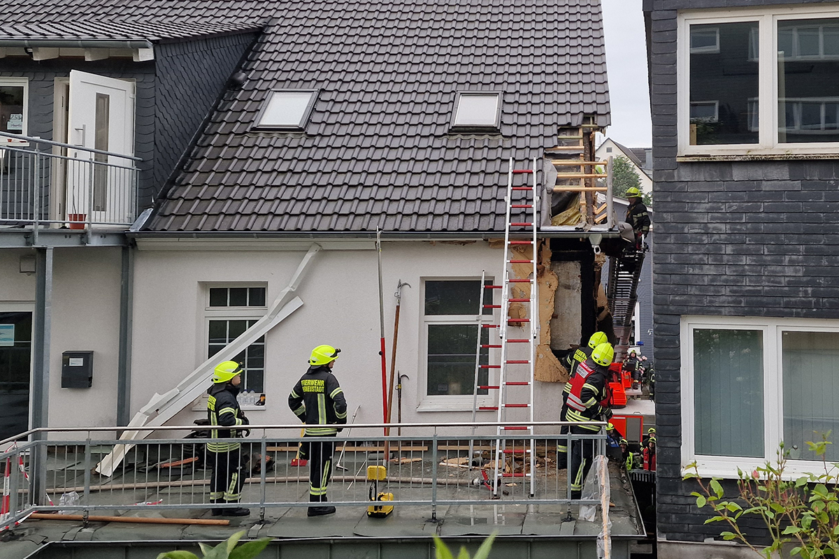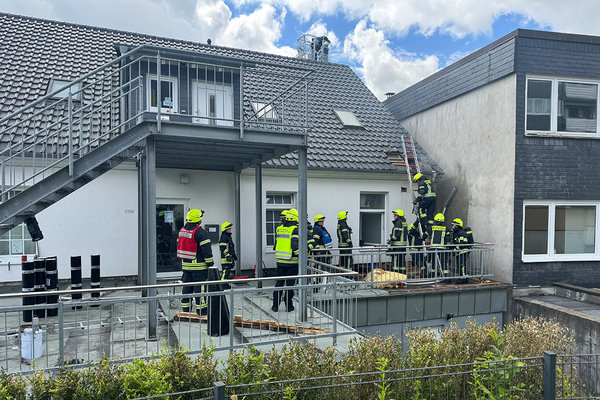 Schweißarbeiten haben am Dienstagmittag gegen 11:40 Uhr zu einem Feuerwehreinsatz im Haus der Sozialstiftung Oberberg in Bergneustadt geführt. Auf der zuletzt undichten Dachterrasse werden derzeit Schweißbahnen verlegt. Das Feuer in der Hauswand des mit Dämmputz verputzten Fachwerks ausgebrochen. Die Löscharbeiten gestalteten sich für die Feuerwehr Bergneustadt zunächst schwierig, da sie nicht an den Brandherd herankam. Das Problem war der geringe Abstand von weniger als einem Meter zwischen den beiden benachbarten Gebäuden, sodass der Einsatz der Drehleiter und einer Steckleiter nicht möglich waren.