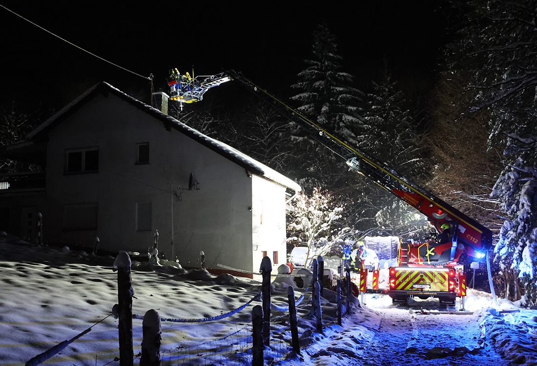[Der Schornstein wurde mit der Drehleiter kontrolliert.]