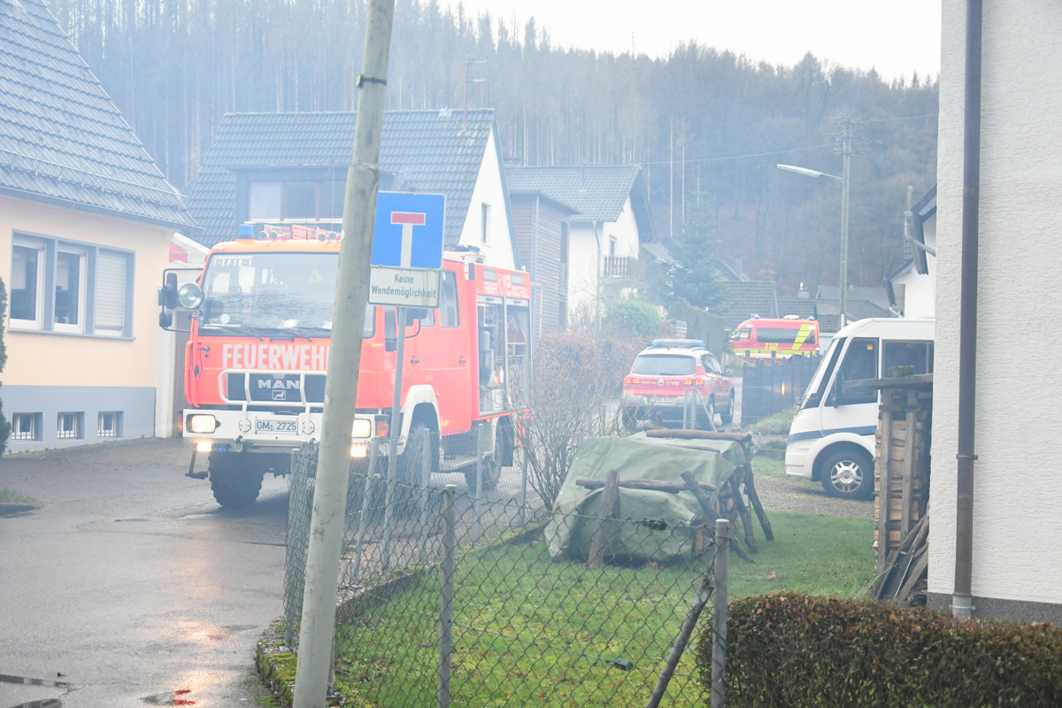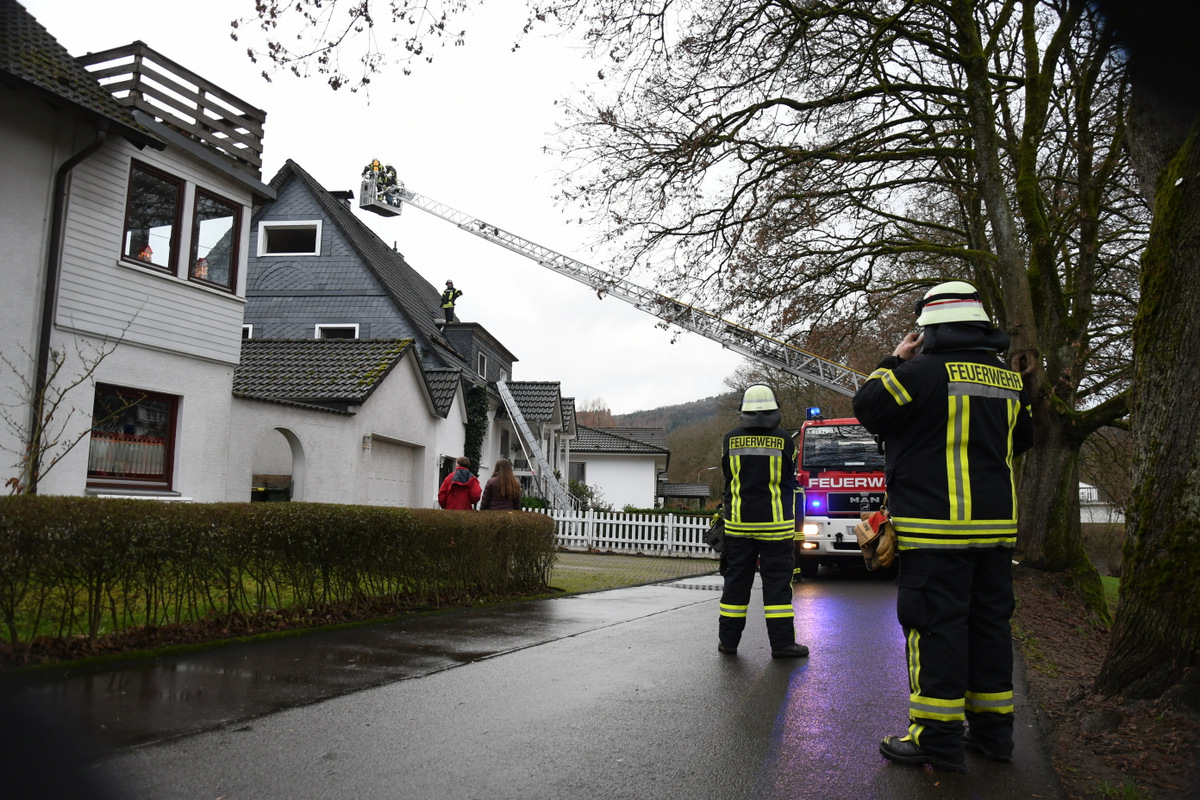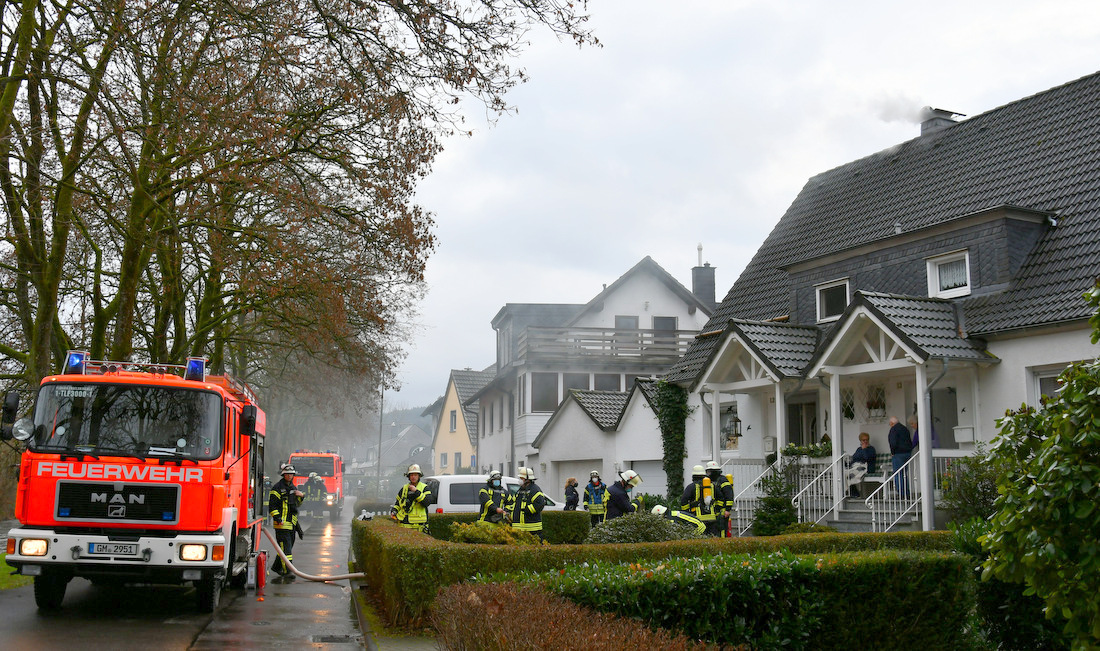 46 Kameraden der Feuerwehr unter Einsatzleitung von Brandinspektor Stefan Neier kümmerten sich dann darum, das Feuer zu löschen und den Schaden möglichst klein zu halten. Der erste Angriff der Wehr erfolgte über die Leiter auf dem Dach, doch wurde die Gummersbach Drehleiter nachalarmiert. Brandgase hatten sich inzwischen über alle Etagen des Hauses ausgebreitet. Auch eine Flammenentwicklung in einer Zwischendecke hatte man rasch im Griff. Die nachalamierte Löschgruppe Loope mit Atemschutz-Geräteträgern musste nicht mehr eingreifen. Neben der Gummersbacher Drehleiter war auch der Einsatzleitwagen aus Ründeroth zur Atemschutzüberwachung.