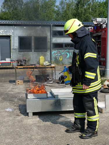 Dass Löschschaum nicht gleich Löschschaum ist, wussten die Probanden eigentlich im Vorfeld. Thomas Auner (Feuerwehr Wiehl) und René Reissig-Hochweller (Feuerwehr Waldbröl) hatten neben weiteren Erklärungen und einigen Versuchsanordnungen im theoretischen Teil auch einen Schaummittelsimulator für die „heiße“ Praxis parat.