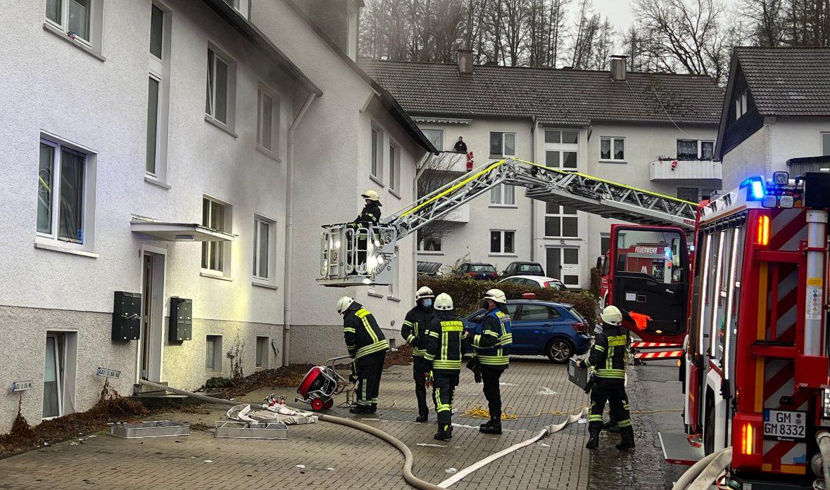Am Dienstagvormittag gegen 11 Uhr wurde die Feuerwehr zu einem vermeintlichen Wohnungsbrand nach Gummersbach-Niederseßmar in die Straße „Auf dem Leibel“ gerufen. Die 35 Feuerwehrleute der hauptamtlichen Wache sowie freiwillige Kräfte aus der Kreisstadt sowie von den Einheiten Niederseßmar und Rebbelroth konnten vor Ort zunächst kein Feuer feststellen. Mithilfe der Drehleiter leuchtete man deshalb in sämtliche Fenster des Mehrfamilienhauses, teilte der stellvertretende Wehrführer Lars Hohmuth vor Ort mit.
