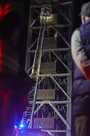 Zwei Trupps unter schwerem Atemschutz rückten bis zu der betroffenen Ebene vor und brachten das Feuer mit einem Kleinlöschgerät zügig unter Kontrolle. Anschließend wurden Nachlöscharbeiten mit einem C-Rohr sowie über die Drehleiter durchgeführt. Zudem kontrollierte die Feuerwehr die insgesamt rund 34 Meter hohe Holzkonstruktion mit einer Wärmebildkamera.