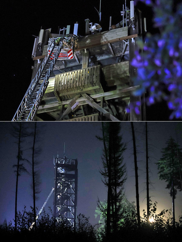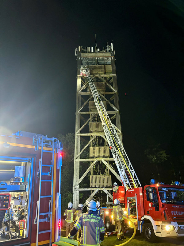 Die ersten Meldungen klangen dramatisch: Etliche besorgte Anrufer wählten am Mittwochabend gegen 20 Uhr den Notruf und teilten mit, dass der Aussichtsturm „Auf dem Lindchen“ in Nümbrecht in Brand stehen würde. Die Einheiten aus Nümbrecht, Bierenbachtal und Hömel rückten unverzüglich mit circa 40 Kräften aus. Auch die Drehleiter aus Wiehl wurde alarmiert.