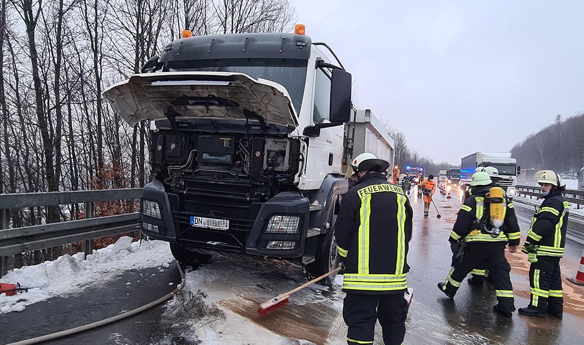 Insgesamt 45 Kräfte der Einheiten Engelskirchen und Ründeroth rückten zum Einsatzort aus, bereits aus einiger Entfernung war eine hohe Rauchsäule zu erkennen. Das wahrscheinlich durch eine defekte Bremse oder ein Hydraulikproblem ausgelöste Feuer hatten die Wehrleute schnell im Griff, allerdings hatte sich wegen einer geplatzten Kraftstoffleitung Diesel auf der Fahrbahn verteilt, weshalb die Unglücksstelle aufwendig abgestreut werden musste.
