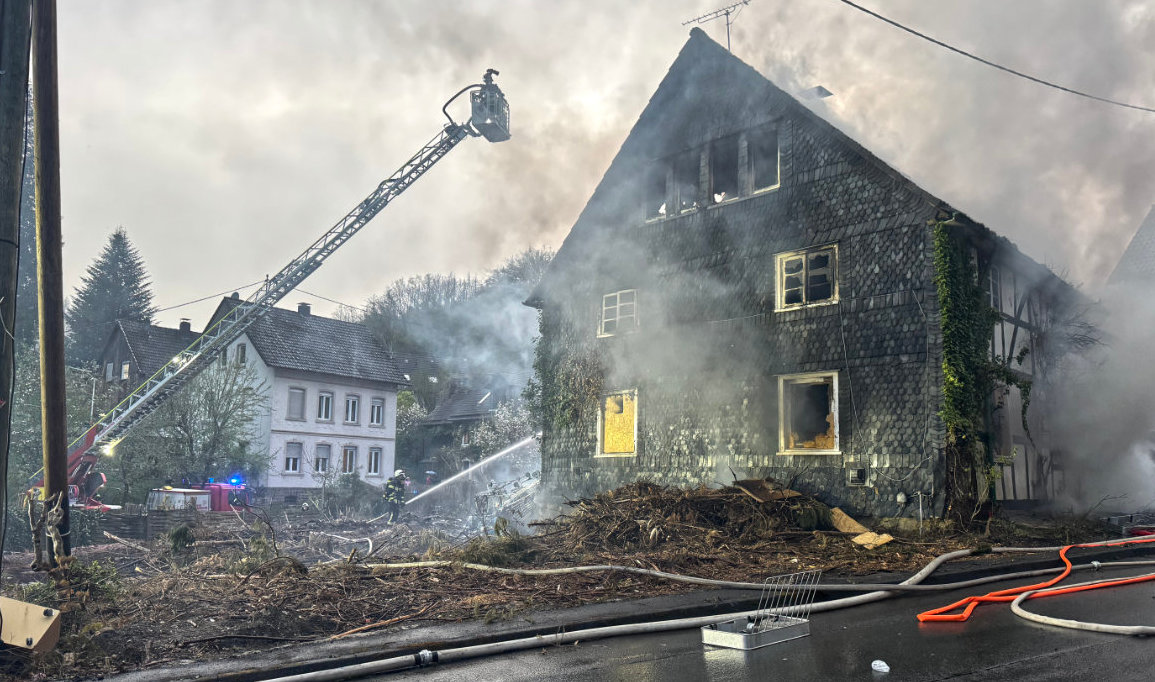 Großeinsatz für die Feuerwehr Gummersbach in Dieringhausen: Ein leerstehendes Fachwerkhaus an der Ecke Burgbergstraße/Hohler Straße ist am Samstagabend in Flammen aufgegangen, der Brand war aus ungeklärter Ursache in der untersten Etage ausgebrochen. Das Feuer zündete im weiteren Verlauf durch und breitete sich bis zum Dachstuhl aus, wie Feuerwehrsprecher Marc Wittpohl vor Ort berichtete. Die erste Alarmierung erfolgte um 19:07 Uhr.