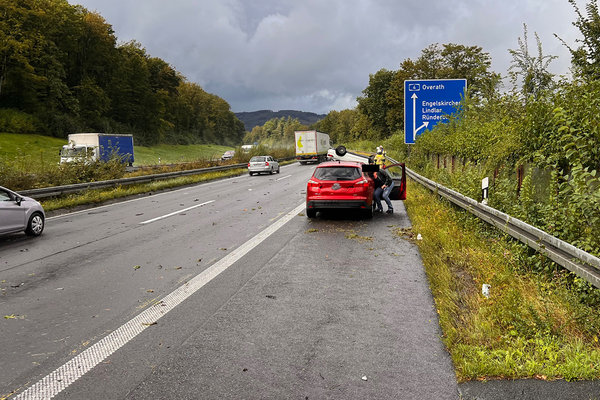 Bei einem Alleinunfall auf der A4 zwischen den Anschlussstelle Bielstein und Engelskirchen ist am Montagmittag ein Mann aus Hagen verletzt worden. Er war gegen 12:20 Uhr in Fahrtrichtung Köln unterwegs, als er auf regennasser Fahrbahn die Kontrolle über sein Fahrzeug verlor, hieß es von der Feuerwehr. Der Mercedes überschlug sich und kam auf dem rechten Fahrbahnstreifen auf dem Dach zum Liegen. Zum genauen Grund konnte Einsatzleiter Björn Ufer keine Angaben machen, die vorangegangenen starken Regenfälle dürften aber eine Rolle gespielt haben. Der Fahrer kam mit vermutlich leichten Verletzungen in ein Krankenhaus.