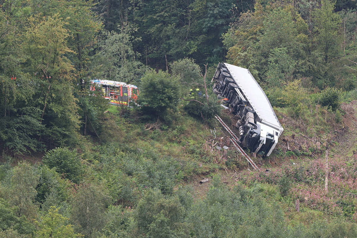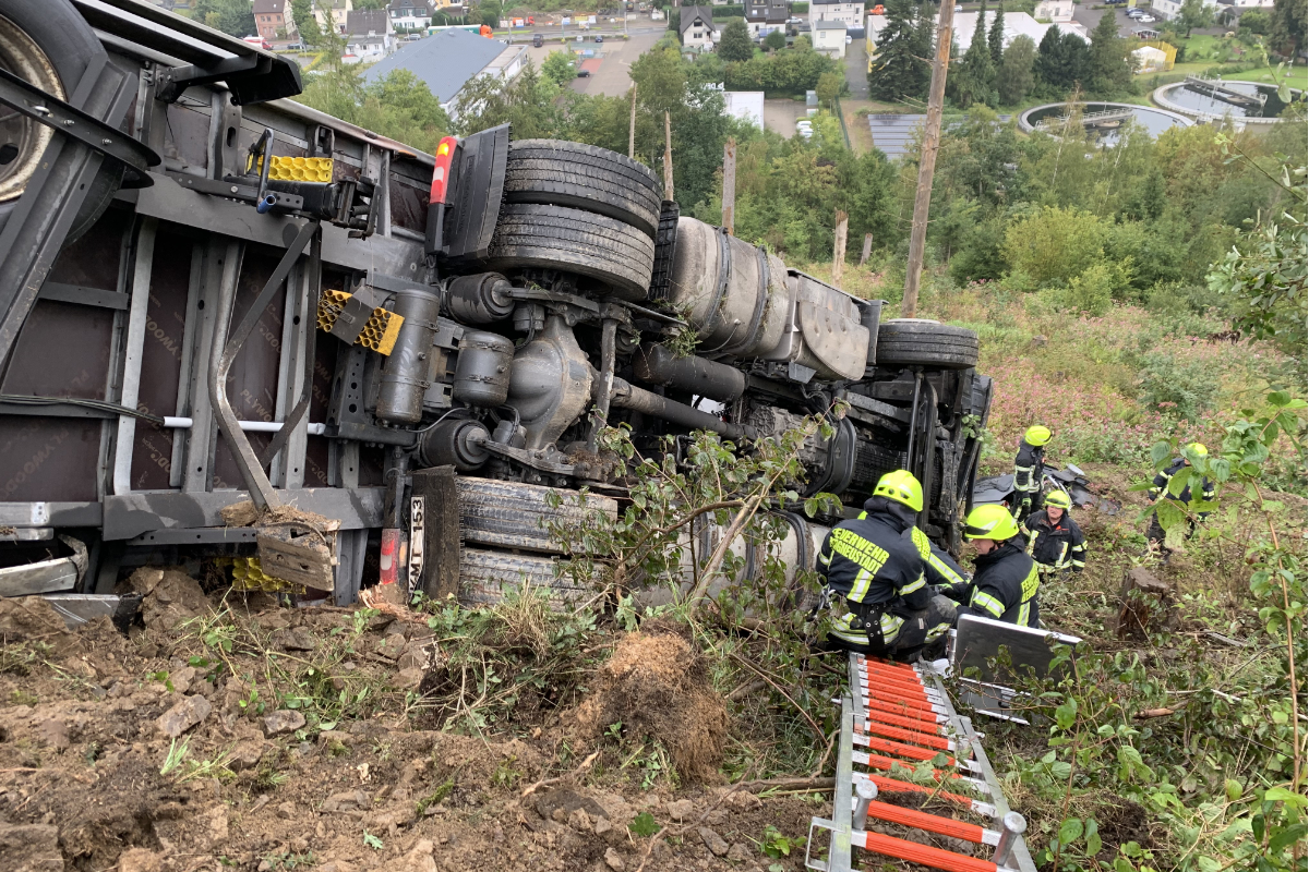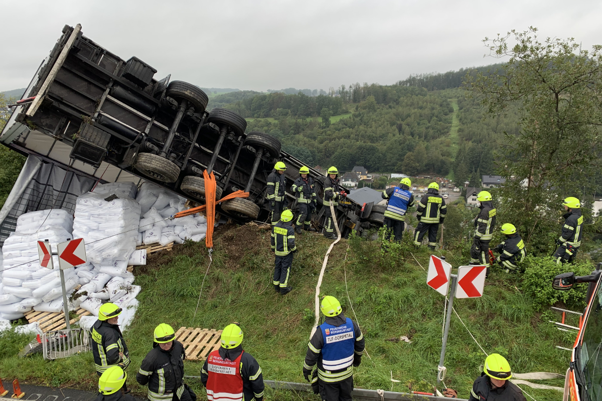 Ein schwerer Lkw-Unfall hat sich am Morgen in der scharfen Kurve auf dem Südring (B 55a) in Bergneustadt ereignet. Die Straße ist bis auf Weiteres in beide Richtungen gesperrt. Wie Bergneustadts Feuerwehrchef Michael Stricker vor Ort berichtete, wurden die Einheiten Bergneustadt und Dörspetal gegen 7:30 Uhr alarmiert. Da es unterschiedliche Angaben zum Unfallort gab, begaben sich einige Kräfte zunächst ins Tal. Als die Örtlichkeit lokalisiert war, wurden die insgesamt 60 Feuerwehrleute zusammengezogen. Der Fahrer war laut Stricker eingeschlossen und musste mittels einer Leiter aus dem unwegsamen Gelände gerettet werden. Über den Verletzungsgrad des Verunglückten konnte er keine Angaben machen.