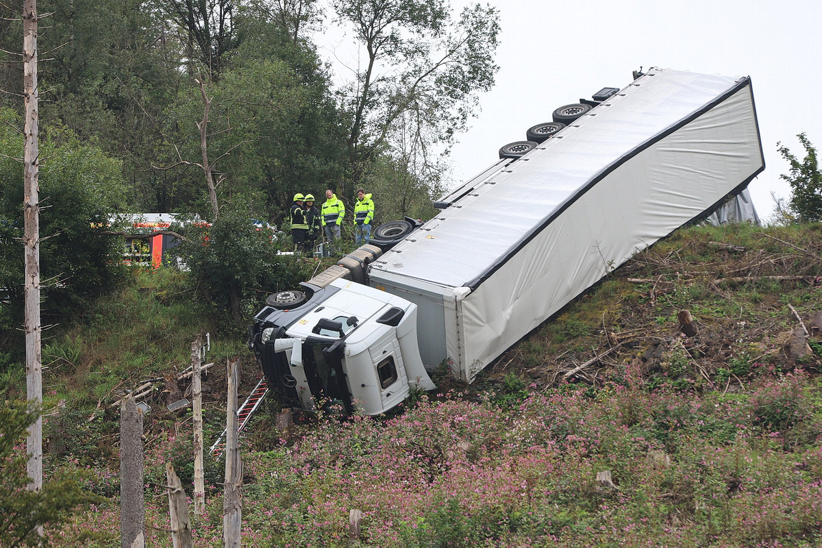 Der mit Kunststoffgranulat-Säcken beladene Lastwagen war von der Autobahn kommend in Richtung Bergneustadt unterwegs, als der Fahrer in der berüchtigten Kurve, die vor einigen Jahren zusätzlich mit Warnlichtern ausgestattet wurde, aus ungeklärter Ursache geradeaus fuhr. Der Sattelschlepper wurde über die aufsteigende Böschung katapultiert und kippte am dahinter liegenden Steilhang auf die linke Seite. Der hintere Teil des Aufliegers ragt über die Böschung, ein Großteil der Ladung landete auf dem Grünstreifen. Nach Angaben der Feuerwehr ist bei dem Unfall Diesel ausgetreten. Ein Bergungsunternehmen wurde zur Unfallstelle beordert.