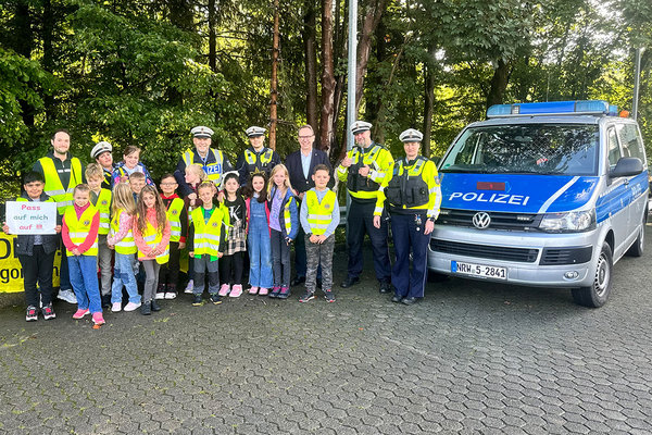 Es ist laut Landrat Jochen Hagt eine alljährliche, aber wichtige Aktion, die heute Morgen gemeinsam von der Polizei, Kreisverwaltung und Verkehrswacht an der Hückeswagener Straße in Gummersbach-Windhagen durchgeführt wurde. 25 Drittklässler der örtlichen Grundschule traten als Paten für die frisch eingeschulten i-Dötzchen an die von den Beamten gestoppten Autofahrer heran, um ihnen Merkzettel mit der Aufschrift „Pass bitte auf mich auf“ und entsprechende Worte mit auf den Weg zu geben.