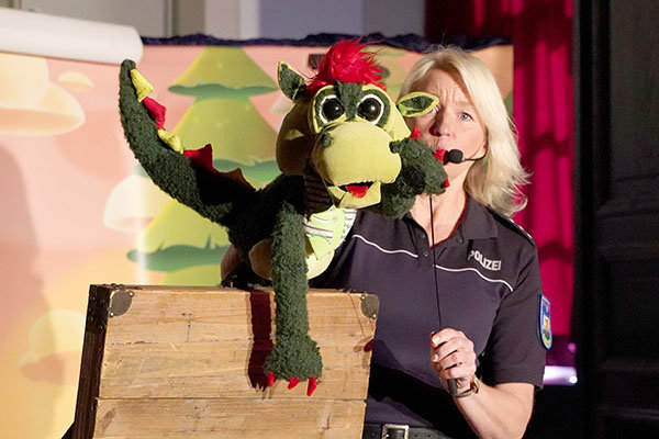Die Puppenspiele zogen nicht nur die Kinder in ihren Bann, sondern auch so manchen Erwachsenen. Dabei kennen die allermeisten Kinder die oberbergischen Puppen Wuschel und Susi bereits aus der Verkehrserziehung im Kindergarten. Aber diesmal gibt es auch noch andere Puppen zu entdecken. Zum Beispiel den Drachen Feo aus Kleve (Foto) oder Esel Käthe aus Bielefeld.
