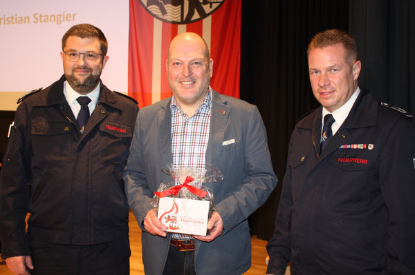 [Unverzichtbare Scharnierfunktion zwischen Gemeindeverwaltung und Feuerwehr hat Stefan Hermann (Mitte) inne. Bei ihm bedankten sich Christian Stangier (li.) und sein Stellvertreter Christian Haag.]