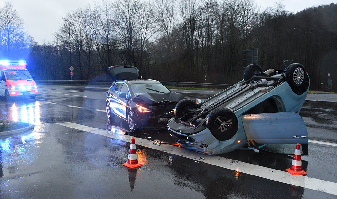 Der Zusammenstoß beider Fahrzeuge war so heftig, dass sich der Fiat der 21-Jährigen überschlug und auf dem Dach liegen blieb – auch an dem Mercedes entstand erheblicher Schaden. Während sich die junge Frau bei dem Unfall schwere Verletzungen zuzog, kam die 57-Jährige mit leichten Verletzungen davon. Während der Unfallaufnahme und den Aufräumarbeiten kam es für etwa anderthalb Stunden zu Verkehrsbehinderungen an der Einmündung.