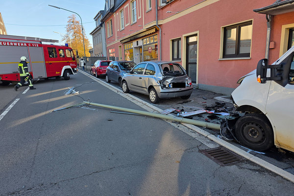 Durch die Wucht der Kollision wurde der Dacia in ein Vorfahrtsschild geschleudert. Der Bäckerei-Transporter krachte in einen am Straßenrand geparkten Nissan. Auch ein davor geparkter Ford Ka wurde beschädigt. Zudem knickte eine Straßenlaterne um, beschädigte dabei ein weiteres Fahrzeug und fiel auf die Fahrbahn. Der 21-Jährige zog sich bei dem Unfall leichte Verletzungen zu. Die 52-Jährige wurde nach Polizeiangaben schwer verletzt. Ihre Beifahrerin, ihre 13-jährige Tochter, erlitt leichte Verletzungen. Alle wurden mit Rettungswagen ins Krankenhaus gebracht.