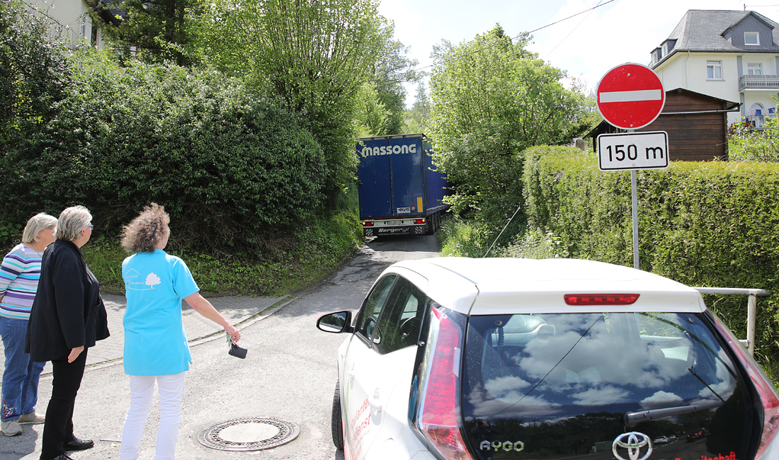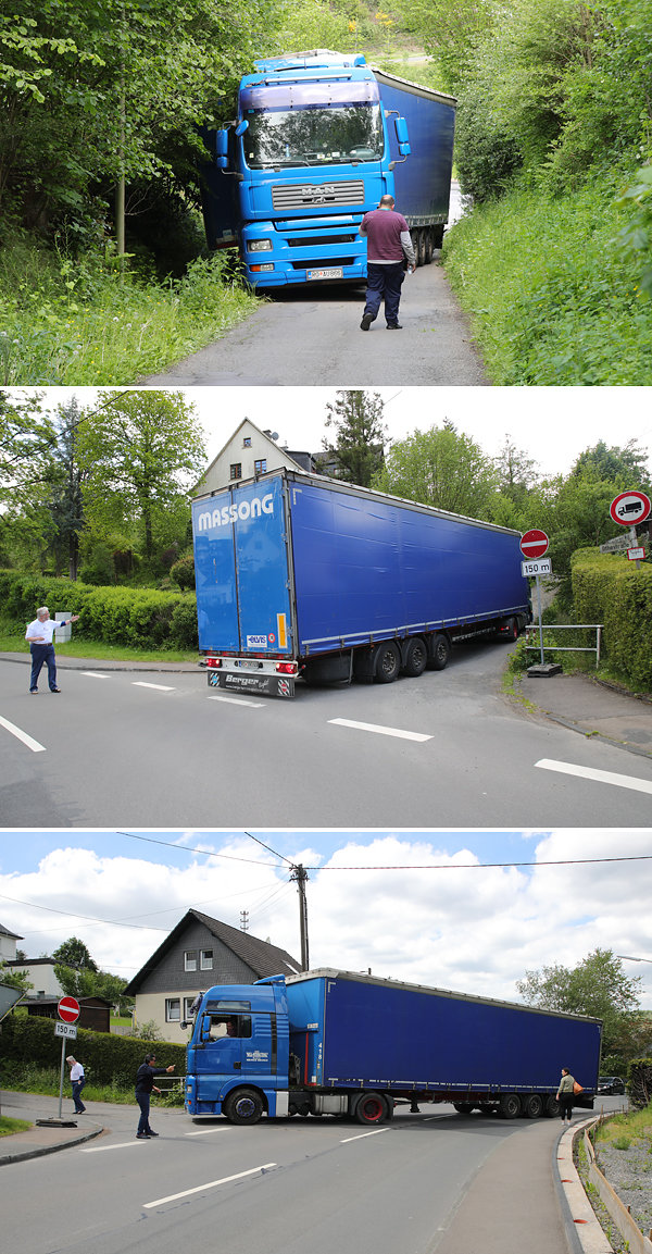 Als der ortsunkundige Fahrer auf der immer enger werdenden Fahrbahn seinen Fehler bemerkte, versuchte er sein schweres Gefährt rückwärts zurück Richtung Hauptstraße zu manövrieren. Dabei geriet er mit dem rechten Reifen der Zugmaschine in die Böschung. Erst nach rund einer Stunde gelang dem Fahrer, sich aus der „festgefahrenen Situation“ zu befreien, berichteten Anwohner vor Ort. Es hatten sich zudem etliche Fahrzeuge auf dem schmalen Weg gestaut, die den Weg über die Serpentinenstraße den Berg hinauf rückwärts antraten.