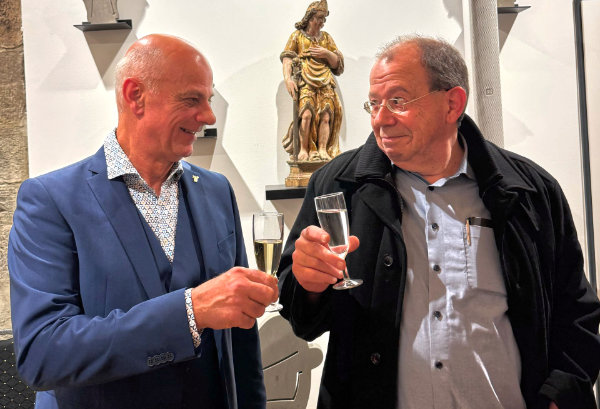 [Ralf Rother und sein Vorgänger Hans-Jürgen Ott stoßen auf ihre Zeit als Vorsitzende des Engelvereins an.]