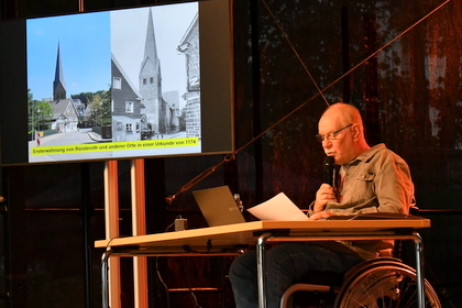 Engelskirchens Bürgermeister Dr. Gero Karthaus (Foto rechts) startete mit dem Slogan, dass Ründeroth „Verdammt alt, aber cool“ sei. Immerhin habe der Ort seit mehreren Hundert Jahren eine ganze Menge zu bieten. „Wer hatte im Oberbergischen im Jahre 1741 schon eine Lateinschule, an der auch Französisch unterrichtet wurde?“, fragte er, um dann, mit Bildern auf Monitoren untermalt, weitere „Besonderheiten“ vorzustellen. Ob die Wilhelmsbrücke, die zwar nicht nach dem Kaiser, aber den fünf Handwerksmeistern, die diese erbaut haben, benannt wurde oder das Millionentor, welches die Friedhofstraße überspannt. Erbaut wurde es in der Inflationszeit 1922/1923 und kostete damals mehrere Millionen Reichsmark, woher der Name stamme.