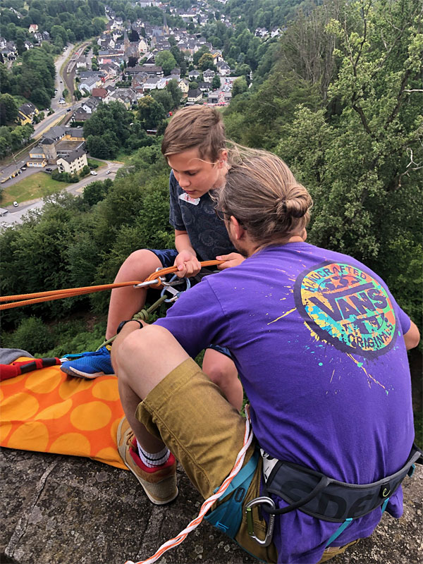 "Das zweite grüne Seil ist zu deiner doppelten Sicherheit, damit fangen wir dich auf.", erklärte Brüggemann einem Teilnehmer. Jetzt war alles zum sicheren Abstieg bereit. Mit dem Rücken in Richtung Abgrund ging es den Turm herunter. Füße gegen die Wand, leicht in die Knie gehen, abstoßen, Seil lockern und nicht nachdenken, hieß die Devise für die Sportler. Meter für Meter kam man dem Boden näher und die Angst verschwand schnell. Unten angekommen ernteten die Teilnehmer den Applaus des Publikums. Am Ende waren alle stolz, die 18 Meter Höhenunterschied gepackt zu haben. Ab September bietet der CVJM neue Aktionen an.