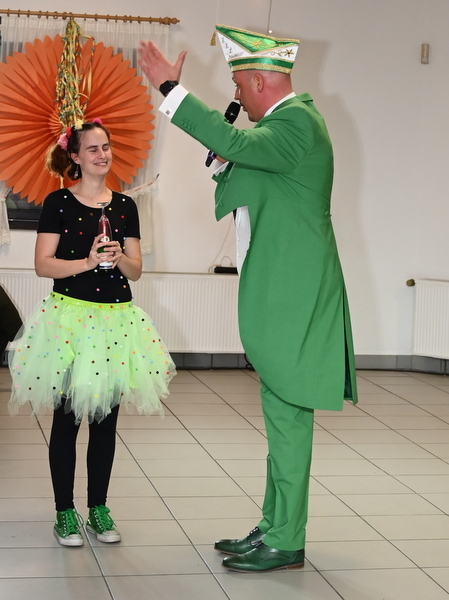„Willkommen in unserer Wahlheimat Doe-Stie-Bu“, freute sich Sven Scherer über das Gastspiel in Dörrenberg, Stiefelhagen und Buschhausen. Mit gut gewählten Worten erwähnte er die bald anstehende Bundestagswahl und forderte das bunt kostümierte Publikum auf, am kommenden Wochenende das Kreuzchen für die Demokratie zu machen. Mit einem Augenzwinkern schwenkte er zum bunten Abend über und verglich die Parteifarben mit dem Getränkeangebot des KKL. Schwarz (Cola) könne auch eine Koalition (mit Kölsch) eingehen, für Rot hätte man einen tollen Wein und wer Grün wählt, für den gibt’s es den beliebten KKL-Schal an der Bonkasse. „Nur braune Suppe haben wir nicht im Angebot“, betonte er deutlich. Als Ehrengäste begrüßte er zwei junge Damen und überreichte jeweils ein kleines Geschenk. Während mit Monika bereits ein Geburtstag an diesem Tag gefeiert wurde, sollte dies bei Conny erst um 0 Uhr so weit sein. „Kein Problem, dann bleiben wir halt alle so lange“, machte er klar.