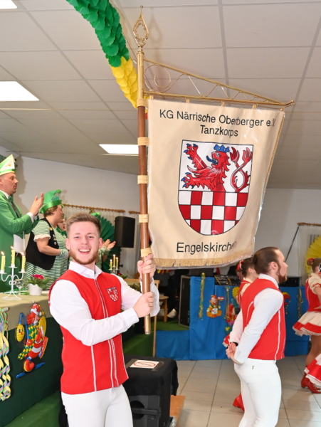„Die Deckenhöhe hier ist immer eine Herausforderung für uns, aber wir freuen uns wieder hier zu sein“, erklärte der Kommandant des Tanzkorps Rot-Weiss Engelskirchen, Peter Trupke, nachdem die über 30-köpfige Truppe Aufstellung genommen hatte. Dem konnte der Standartenträger lachend zustimmen, hatte er wegen dieser Problematik doch direkt auf die untere Hälfte seines Stabs verzichtet.